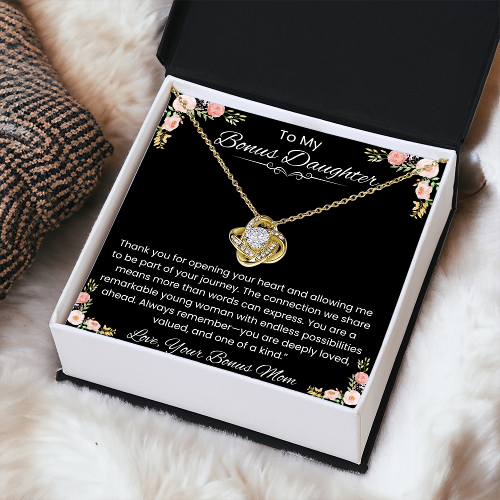 To My Bonus Daughter – Message Card from Bonus Mom | Love Knot Necklace | Family Isn't Defined by Blood Gift