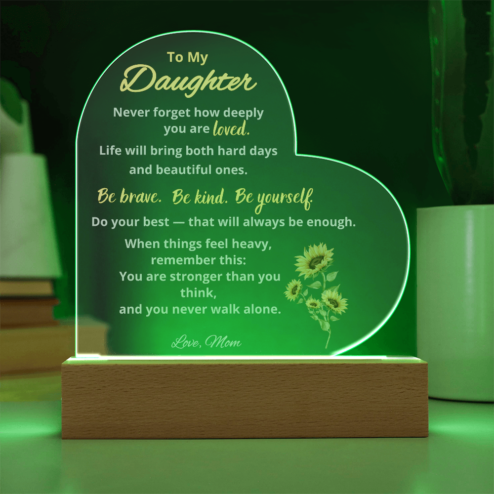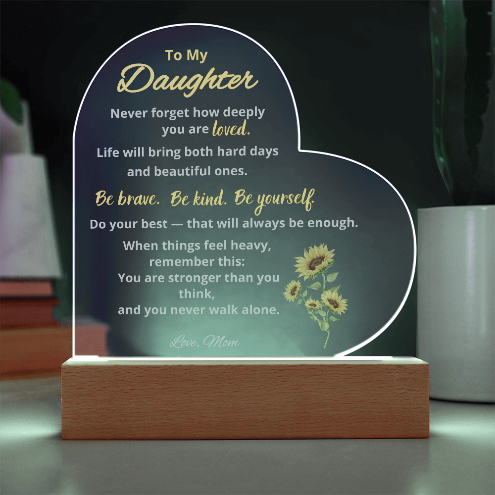 This heart-shaped acrylic plaque was created for the daughter who needs reassurance, encouragement, and a reminder that she is never alone. Gently illuminated on a wooden LED base, this keepsake brings warmth, comfort, and meaning to any space.
